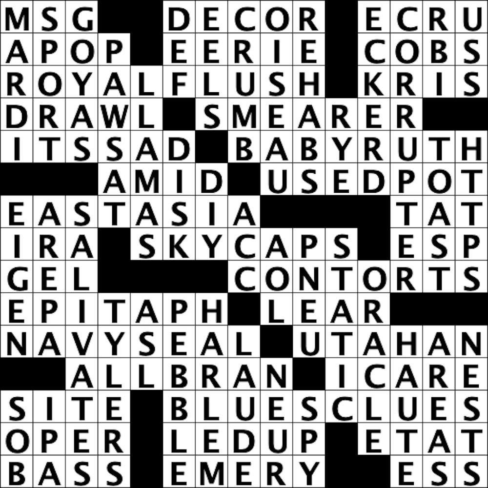 9A: Judging from her invocation of several sophisticated hues, Corless must have been a fabulous art student in middle school. However, if you’re like me and you just barely scraped by — drawing stick figures and suns in the corner of your paper well into your teens — then you may be unaware that light beige is also referred to as ECRU.