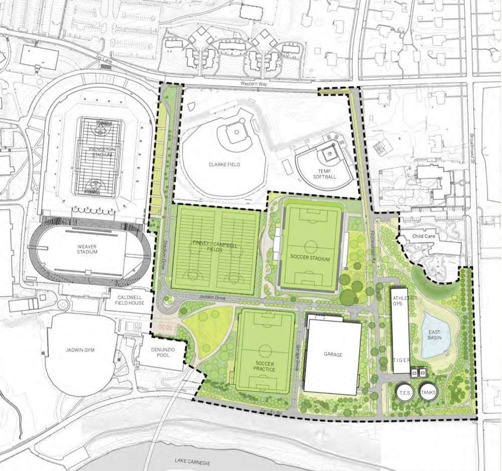 East Campus refers to the 141-acre area bounded by Western Way to the north, Faculty Road to the south, Broadmead Street to the east, and Princeton Stadium to the west. The plan would affect 33 acres and introduce a five-level parking garage, a geo-exchange heating and cooling facility, a soccer stadium, a practice field, and buildings for engineering and environmental studies.